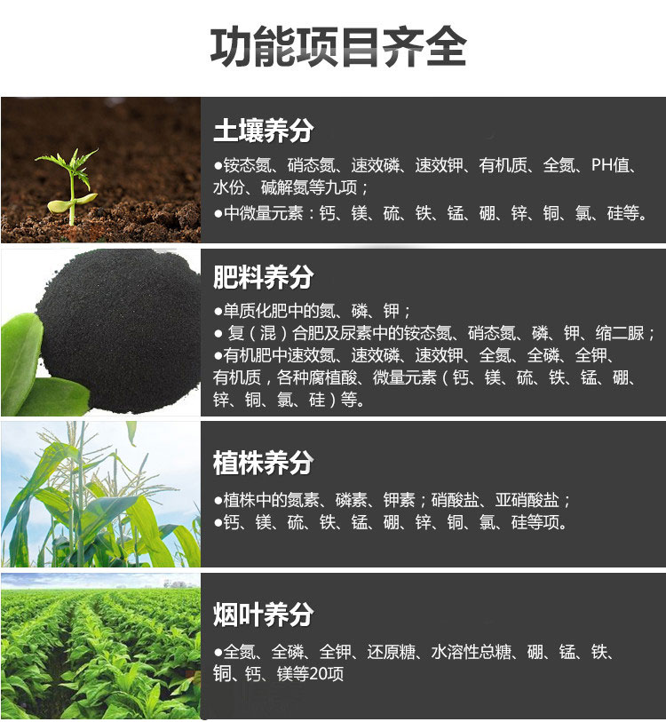 1.土壤和化肥、有機(jī)肥料(包括葉面肥料、水溶性肥料、噴施肥料等)、有效氮、速效磷、速效鉀、總氮、總磷??偭?、有機(jī)質(zhì)、酸堿、鹽分、鈣、鎂、硫、錳、硼、鋅、銅、氯、硅等微量元素。