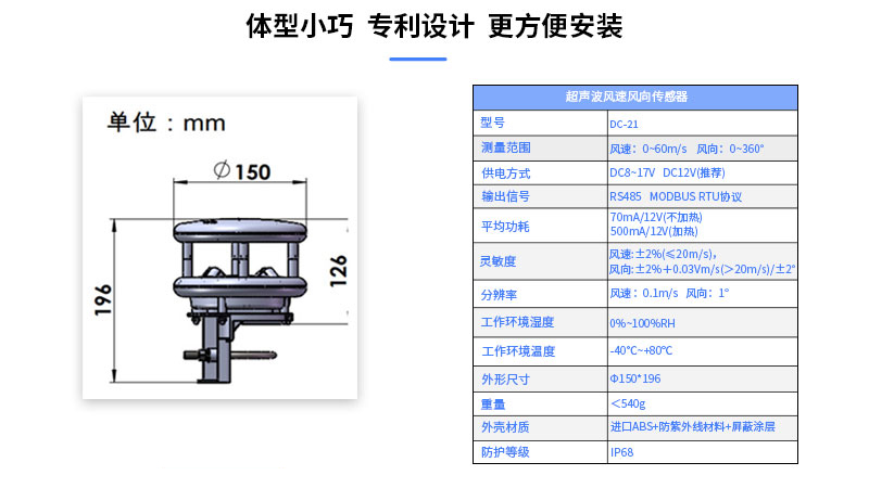 測量范圍風(fēng)速:0~60m/s 風(fēng)向:0~360°